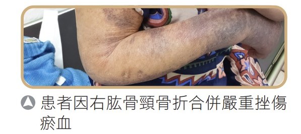 83歲的吳女士走路不慎跌倒以手撐地,右肩腫脹疼痛難耐,至急診檢查後發現是右肱骨頸骨折合併嚴重挫傷瘀血,沒有外傷傷口,因年紀已大,吳女士的開刀意願較低落,雖然服用了急診醫師開立的消炎止痛藥物,局部疼痛及腫脹仍越來越明顯,甚至連晚上也痛到睡不著。於是吳女士至本院中醫骨傷科門診求診,經過醫師評估 X 光骨折情形後,使用本院的如意金黃膏布貼敷並輔以骨折固定治療、中藥內服治療,右上肢明顯消腫、瘀血隨時間減退 ( 如圖 ),右手也恢復日常功能活動,吳女士十分滿意。