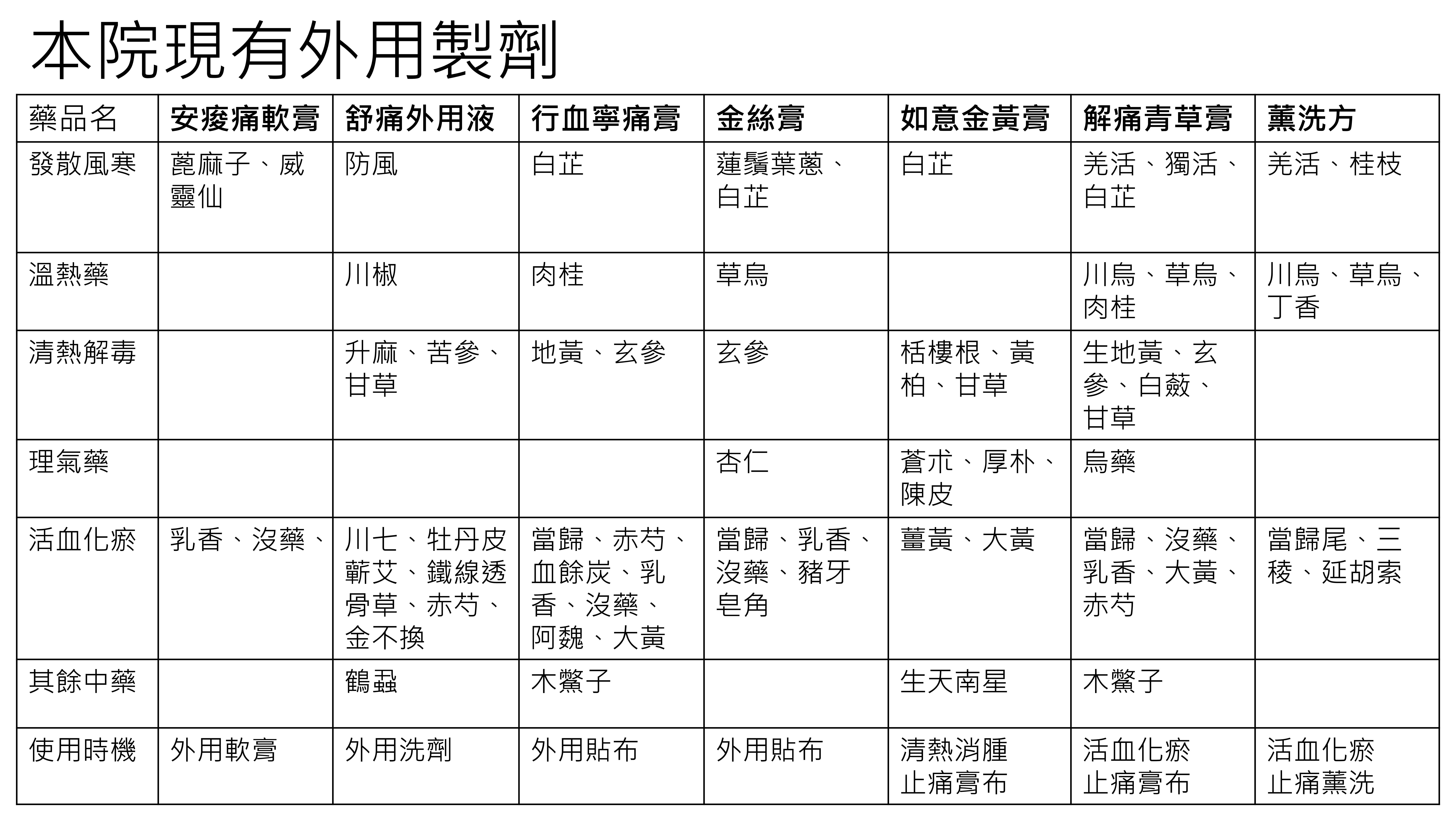 除了如意金黃膏之外,本院還有許多外用製劑,如功擅消除外傷瘀血的解痛青草膏、適用於冷敷的金絲膏,以及行血寧痛膏等,適用於各類病症。其中薰洗方亦是本院特色,傳承千年特色的薰洗療法,將具有疏經活絡止痛功效的中藥藥液加熱後薰蒸於患部,不但非侵入性、適用於害怕針刺的患者,且對於退化性關節炎等發炎不適更是具有良好之效果,本院新成立的薰灸中心更可以提供患者所需之服務,患者可透過醫師診斷,找出適合自己的治療方式。