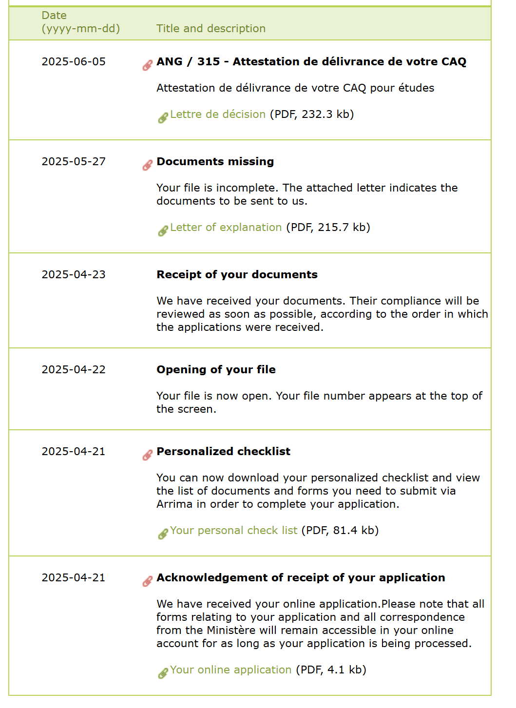 CAQ的申請相對容易,網路上也已有很多教學,但是時間仍是需要一個半月左右的,以我們來說,4/21送出申請,5/27時收到通知(Documents missing)告訴我們說,其中需自己印出手簽的聲明,簽名檔要跟護照一樣(如護照為中文,也要簽中文,原先我們簽的是英文的),趕緊補件以後,6/5收到核准通知,耗費時間為六周。此處提醒大家,注意CAQ的簽名必須簽中文,才不會被退件重簽 (時程如下供參考)。