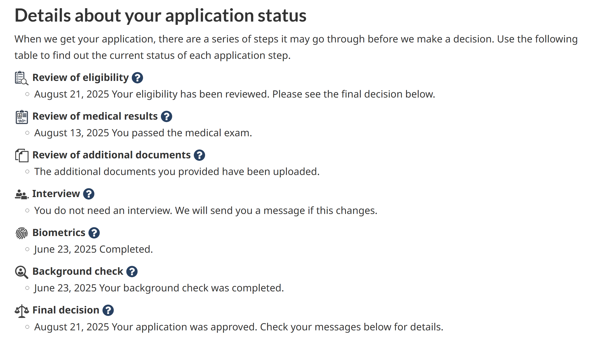 8/21號一早,信箱收到了IRCC的通知,趕緊點進網頁看,居然是需要補件良民證!結果去警察局一問,官方規定是2.5個工作天,依照不同警察局取的時間為2~3天不等,心想完了,這樣我們肯定趕不及八月底的開學,幸好在電話中請教,根據臺北警察局外事組告知(2025/8/19時資訊),全台灣只有台中和苗栗可以現場三十分鐘快速取證,台中我們沒有再做確認,但去電苗栗警察局確認確實可以辦理以後,當日下午直接衝苗栗辦理(四點以前到可以當日完成取件)。上傳良民證2天以後,8/23就收到了Study permit通過的通知(距離我們送出申請恰巧10周整,此時IRCC網站的預估時間是11周)。這邊的提醒是:如果送出申請的時間還早,距離開學還有至少預留三個月以上,可以考慮等通知再申請良民證。也可以一開始就申請良民證一起送出。如果時間離開學已很接近仍然沒收到Study permit,可以提早先去申請良民證,就不用像我們衝一趟苗栗一小時遊(時程如下供參考)。
