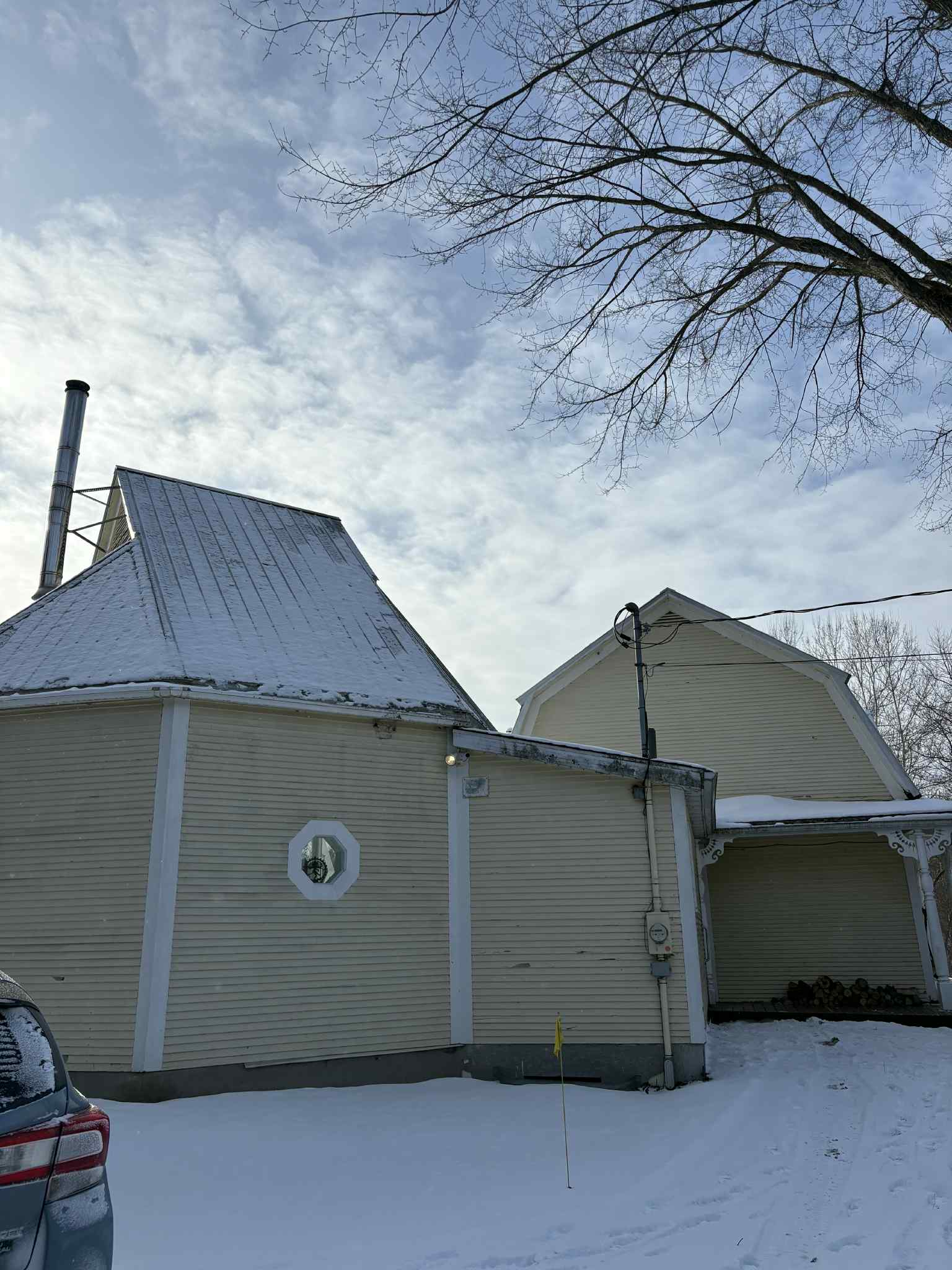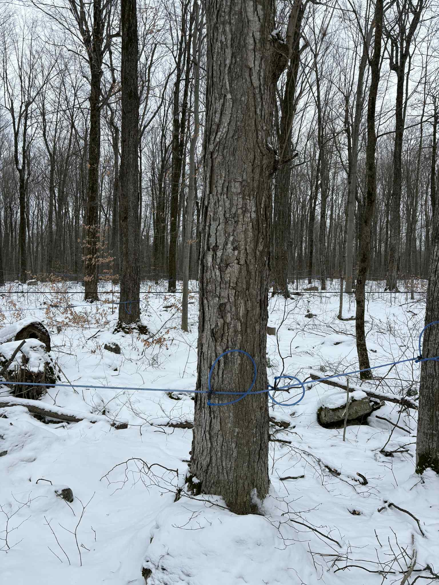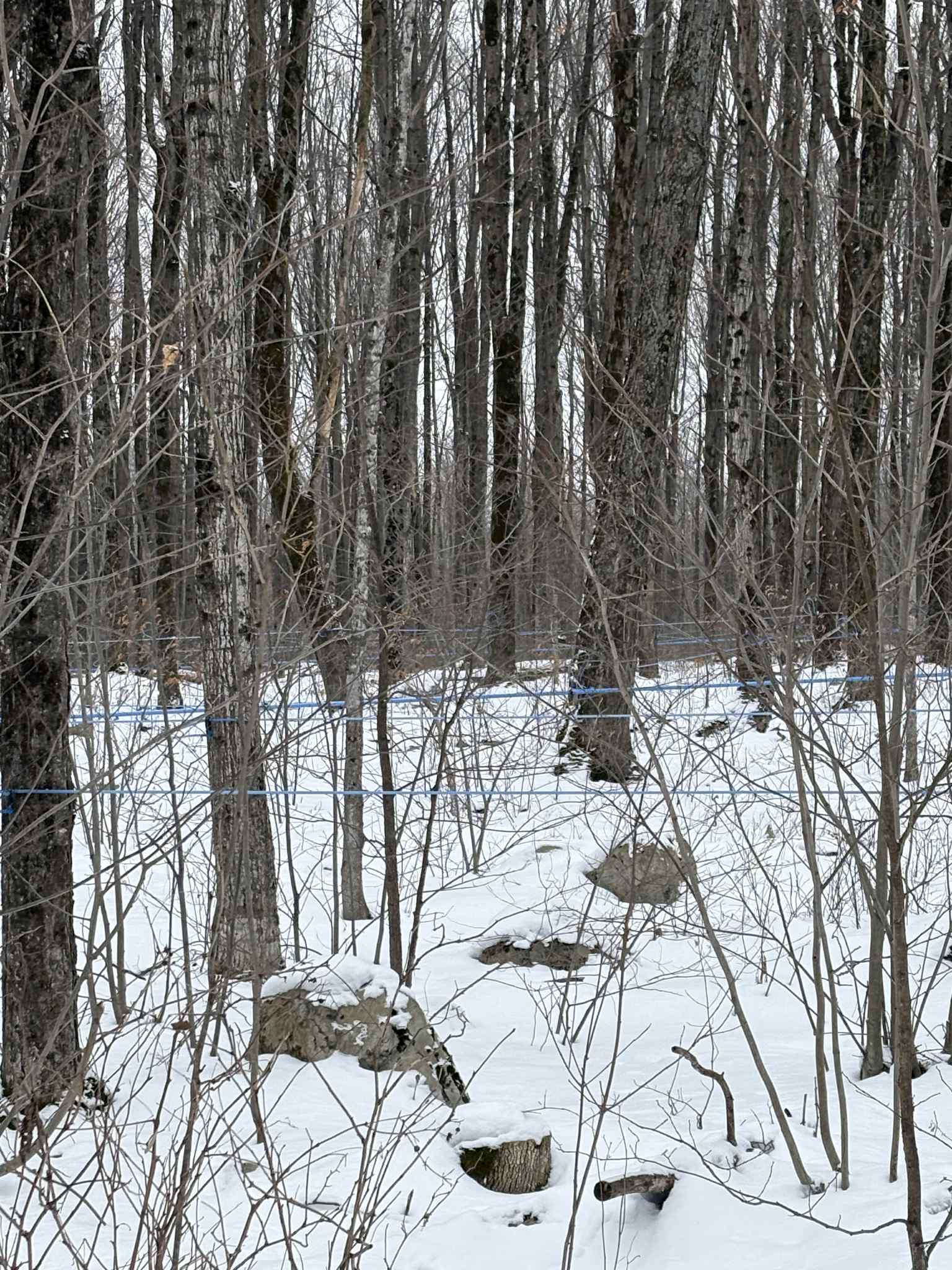 最有趣的是看到了楓糖產製的現場,魁北克省是楓糖主要產地之一,農場周圍都是楓樹林,春天三月左右開始回暖時,楓樹根部儲存的澱粉會在溫暖白天轉化成糖分,在寒冷夜晚樹液產生壓力將汁液往上擠,此時農人會在樹幹鑽孔,引出透過晝夜改變往上移動的汁液,一開始引出的是含糖量約 2-3% 的楓樹汁,此時外觀像水一樣,接著再經長時間加熱蒸發水分濃縮至66.5% 糖度,才會形成濃稠的楓糖漿