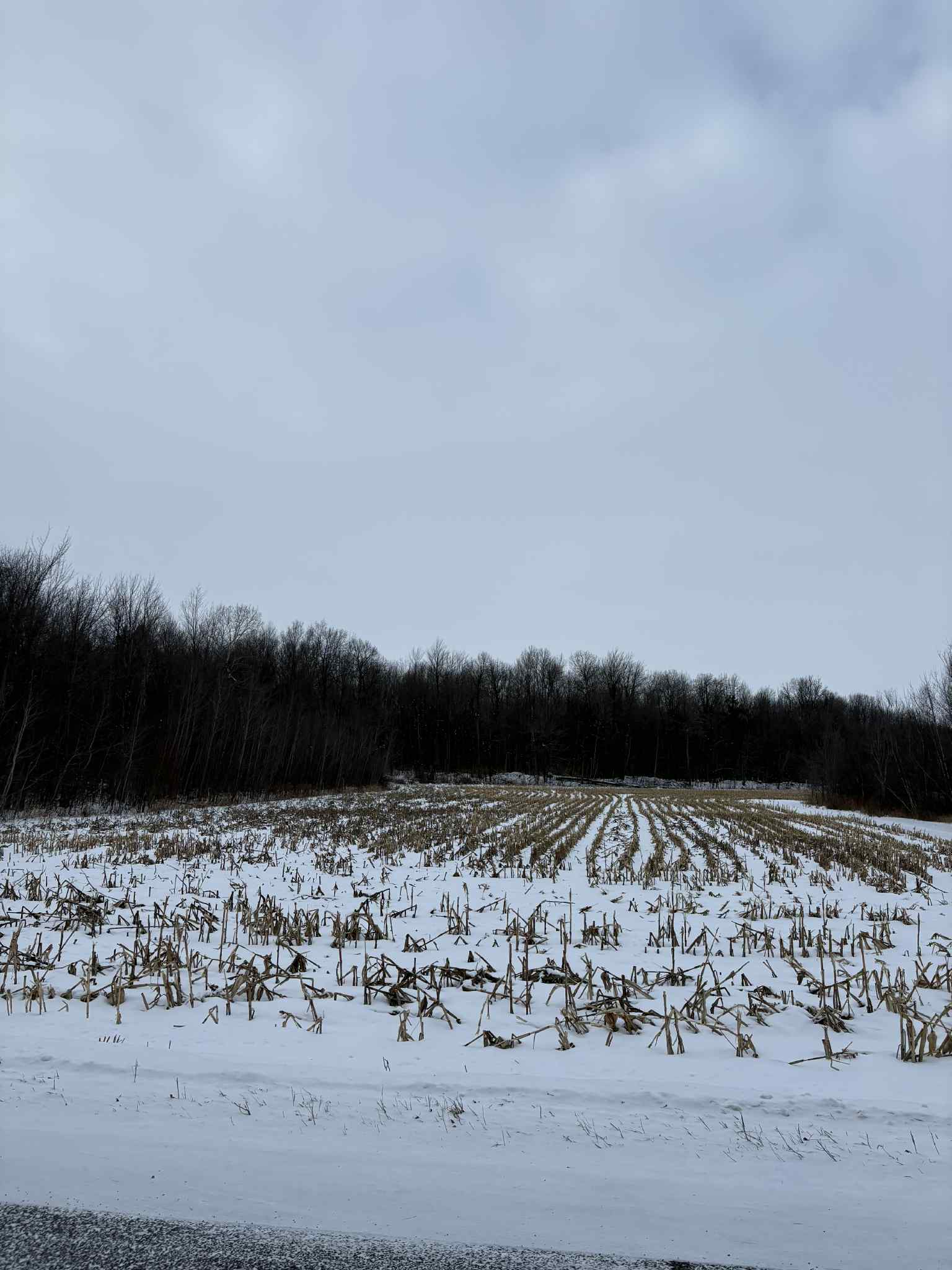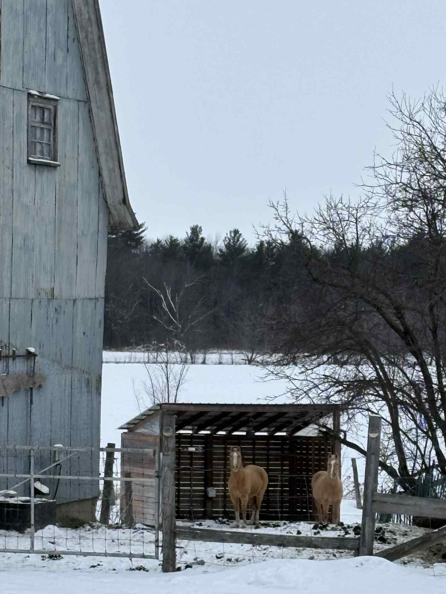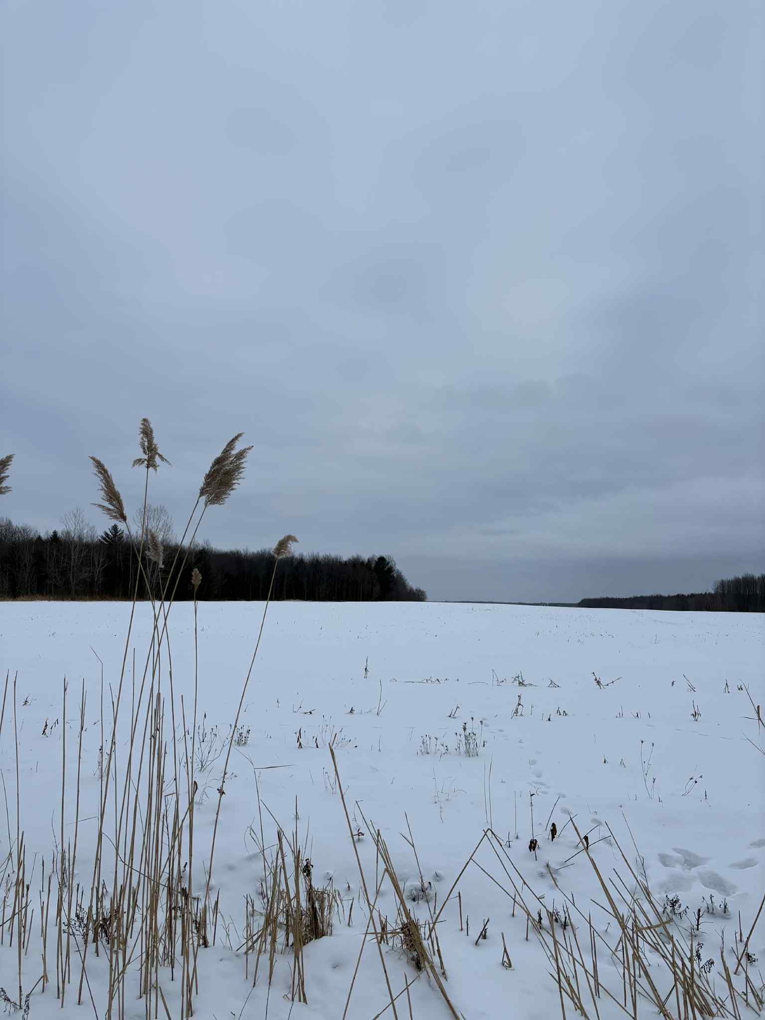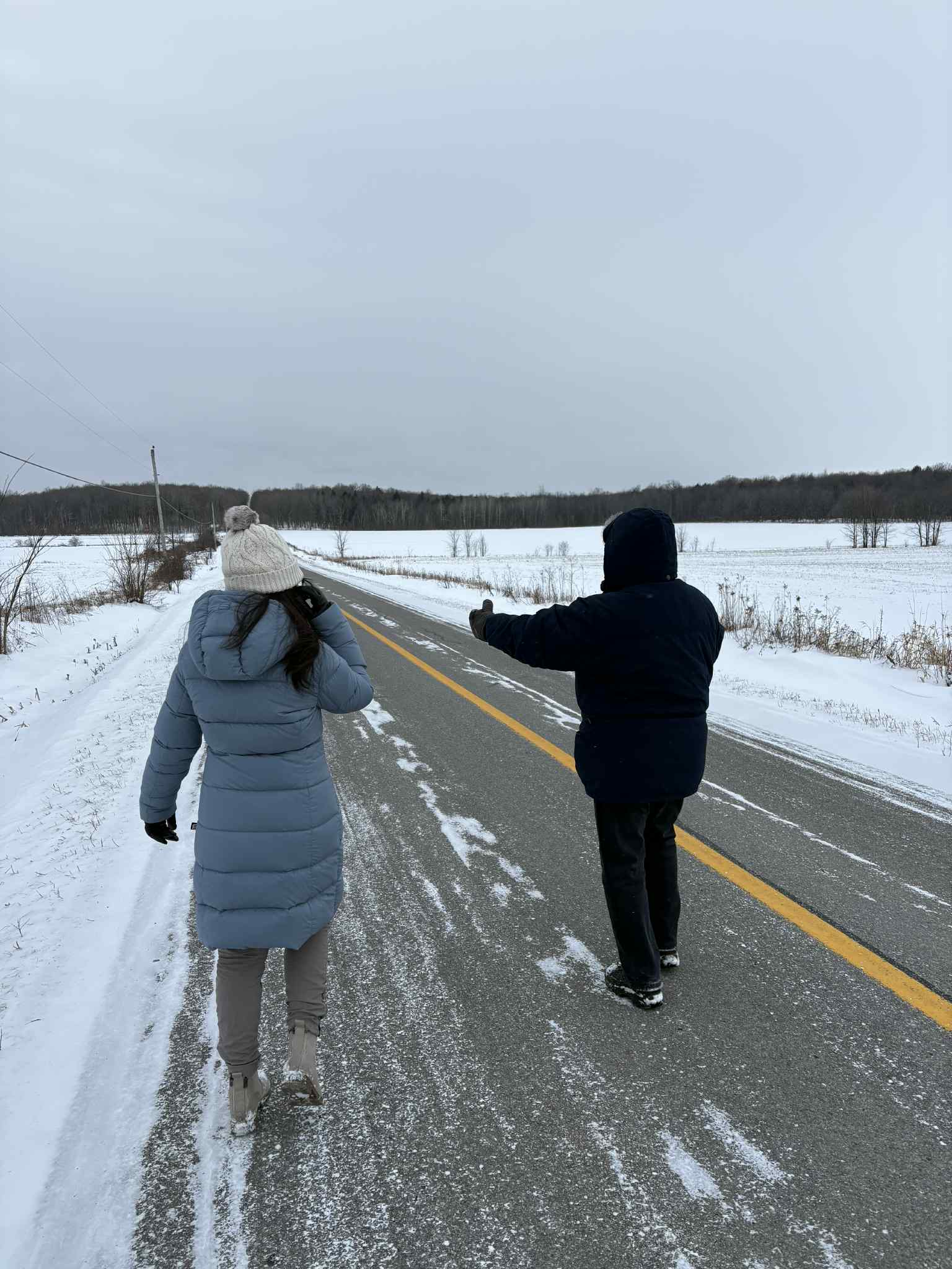 午餐後大家穿著厚厚的衣服,出去農場周圍散步,戶外大概-20度左右,飄著小雪,雖然冷,但在雪白的曠野中,看到了冬日的玉米田、可愛的馬跟狗,還有加拿大鵝的足跡