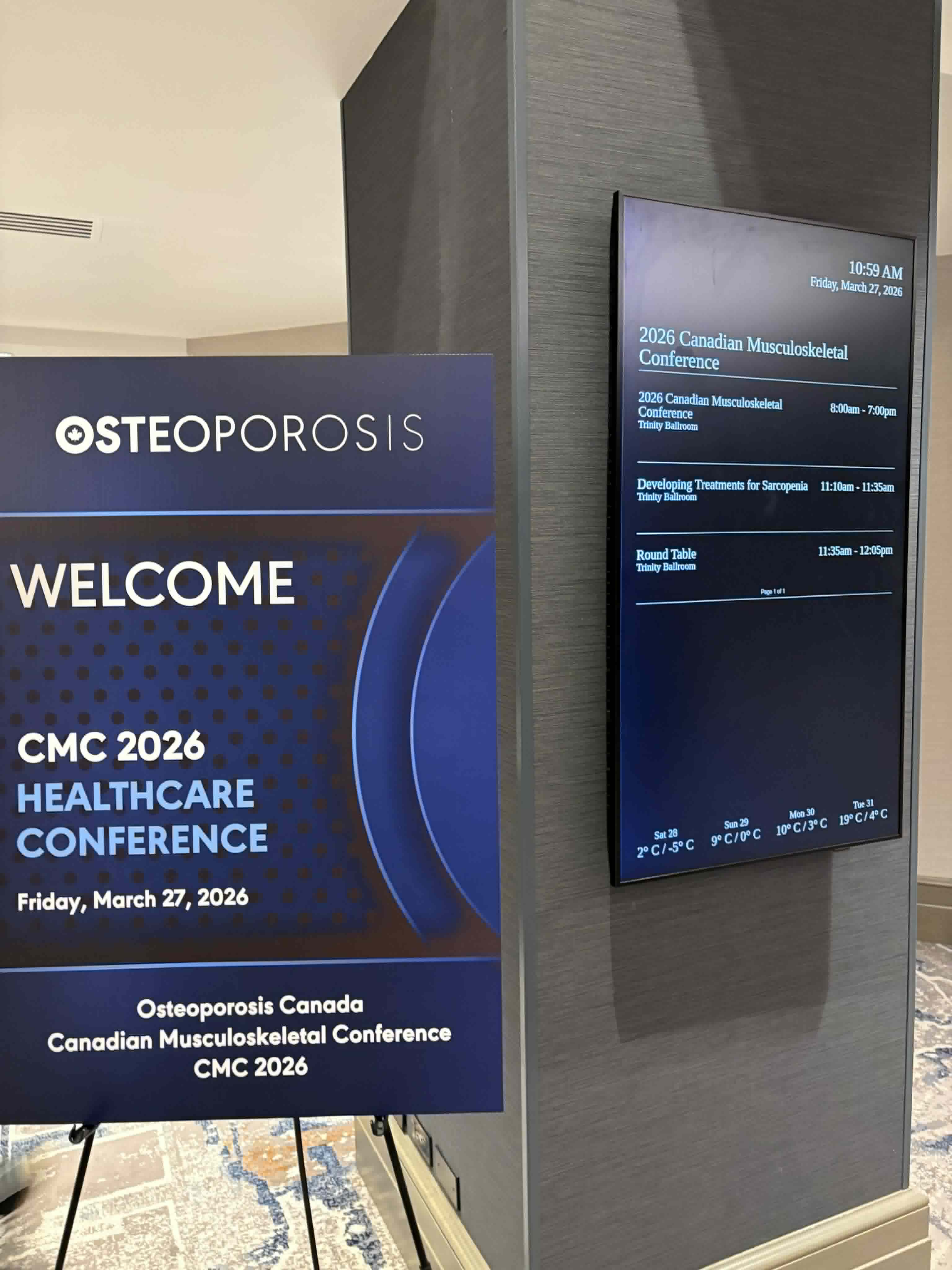 第一日的OsNET clinical research day主要是加拿大各地研究骨質疏鬆的學者組成的研究網絡,跟我以往參加的會議很不一樣,但大概只有不到三十人,三分之一是導老師,三分之二是學生,非常的重視學術社群的連結性,碩博士生導師們除了有學術分享主題,也會在茶敘空檔各自向彼此介紹學生,當然強迫發言交流的活動參加起來也很費神就是了,一日的會議後還接著一個晚宴,一樣連結性很強,跟指導老師散步回飯店時聊了兩個話題,一是北美非常重視重這樣的學術連結,甚至有時候是碩博士生初登學術舞台的台階,在台灣似乎比較沒有這樣的習慣。另外是他們這樣的交流分享會不會有偷idea的問題,聽起來因為大家來自加拿大各個省份,在某專業領域內大家也很熟,所以更像Collaborator可以進行一些跨省或合作研究