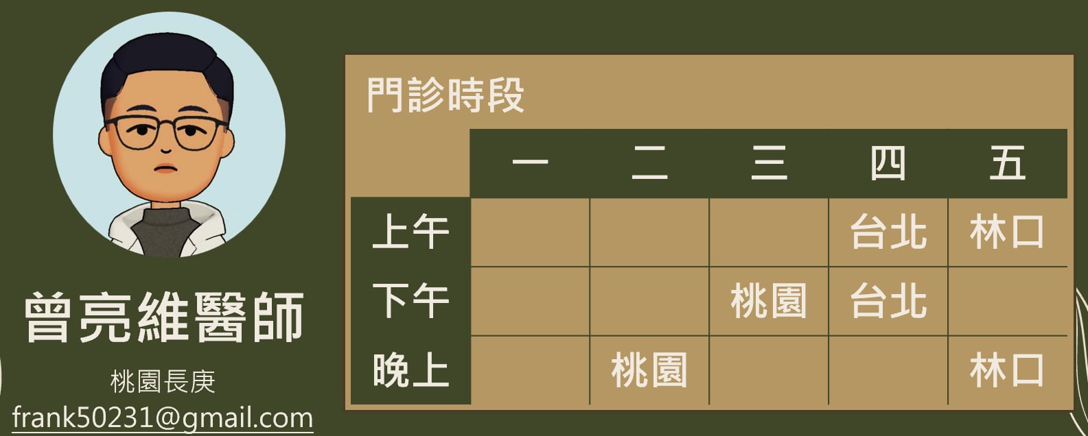 首頁關於我們 關於我們 我們是任職於桃園/林口/台北長庚醫院的兩位中醫師,分別在中醫骨傷科及中醫內科服務。(由於2025/8~2027/8至加拿大蒙特婁Mcgill University進修,臨床服務目前暫停)